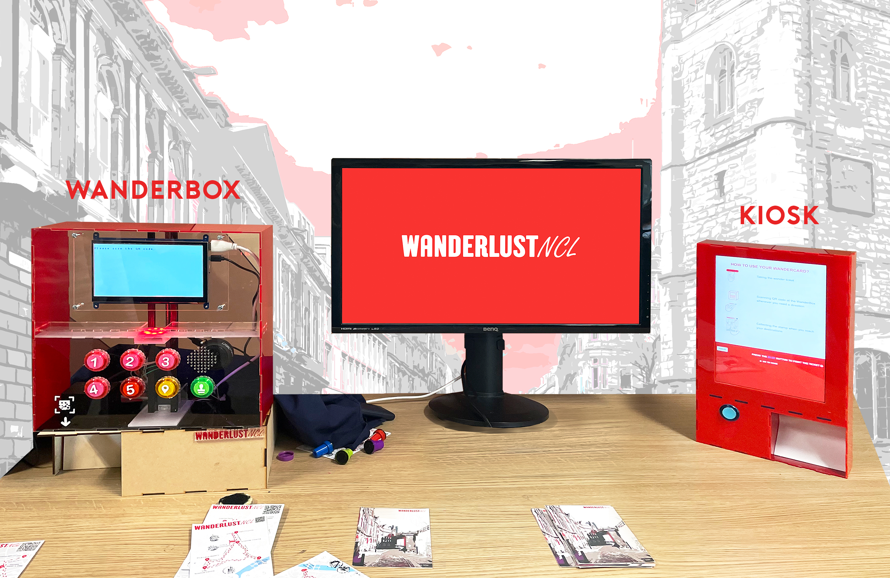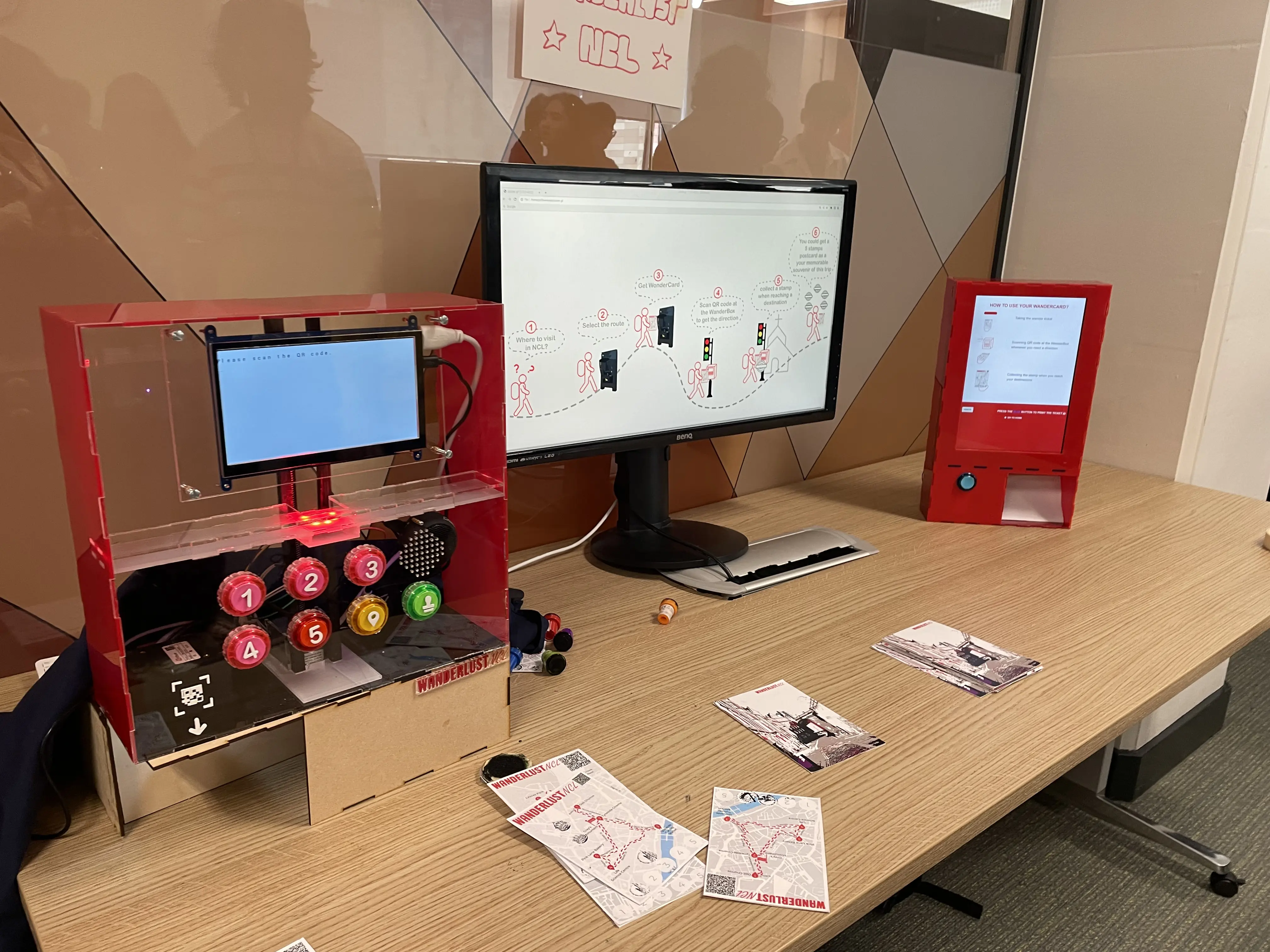 - We designed our system to incorporate it into the existing kiosks around Newcastle, where tourists can start their initial participation by selecting their desired route and obtaining a WanderCard. This ticket records their route information and also a reward system in the form of a souvenir.