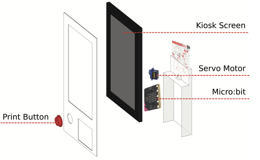 Our kiosk is built with a Surface tablet for display, a Micro:bit, a servo motor, and an arcade button. The servo motor, controlled by the Micro:bit and button, rotates to drop the WanderCard onto a tray, simulating a printer mechanism.