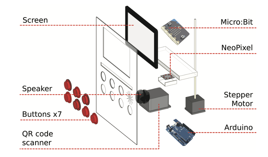 We are using various components for our two prototypes, including Raspberry Pi, Arduino and two Micro: bit, neopixel, servo motor, stepper motor, TB6600 stepper motor driver, mini LED display, speaker, Surface tablet, QR code scanner and 8 arcade buttons.